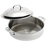 The 4 quart sauteuse pan features a domed lid, essential for keeping moisture in as you simmer or bake a casserole in the oven. This pan is equally well-suited for braising and browning meats and veggies atop the stove. The new MC2 cookware combines the industrial style of a brushed aluminum exterior with gleaming stainless steel stay cool handles and lids.